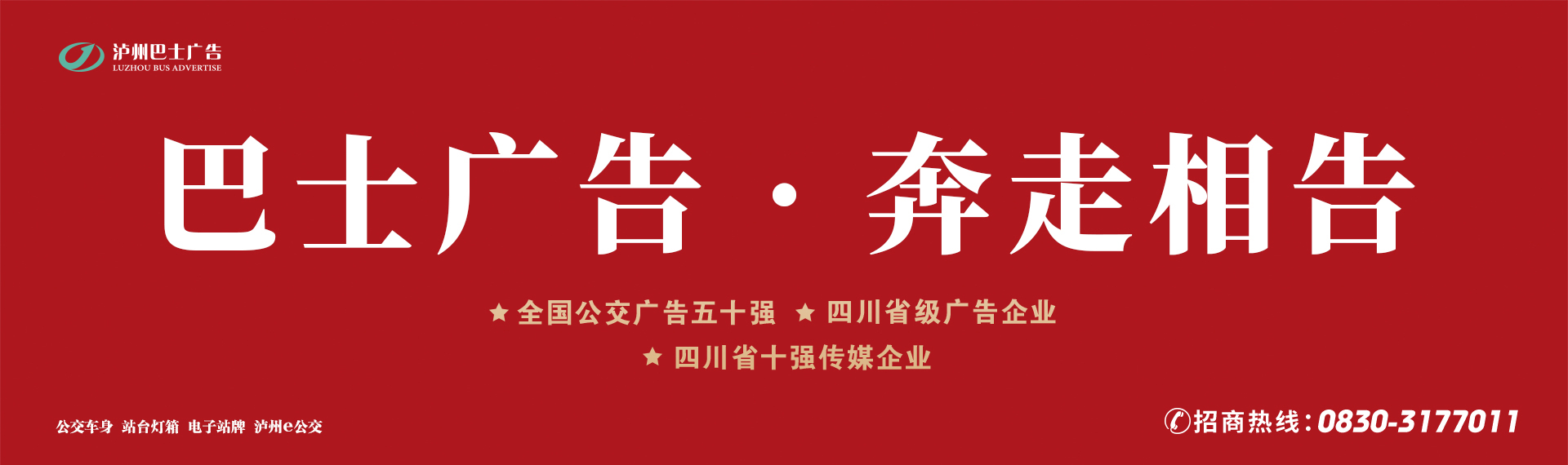 瀘州公交巴士廣告公司創(chuàng)建于1992年3月,是瀘州城市公交廣告媒體唯一經(jīng)營單位,媒體傳播及綜合影響力在同行業(yè)中穩(wěn)居前列。一直以來,秉承著“依法治企、制度管理、誠信為本、創(chuàng)新超越”的治企理念,立足城市公交服務(wù),開展實(shí)施“文化+公交”服務(wù)模式,圍繞“一線一特色”,為企業(yè)傳播價(jià)值,為社會(huì)傳遞正能量。