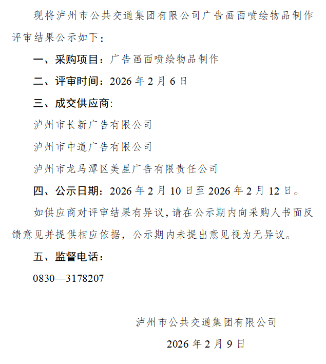 瀘州市公共交通集團(tuán)有限公司廣告畫面噴繪物品制作評審結(jié)果公示
